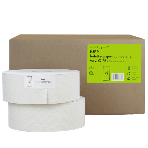 Die Jumborollen "JUPP " von Green Hygiene bestechen durch ihre ausgezeichnete Nachhaltigkeit. Die Produktion erfolgt zu 100% CO2-Neutral und unter alleiniger Verwendung von recyceltem Altpapier. Gleichermassen ökologisch ist die Verpackung, bei der vollständig auf Plastik verzichtet wird. Jutta-Renate ist somit zu 100% Plastikfrei. Das ideale WC-Papier für den umweltbewussten Hygienebereich von Raststätten, öffentlichen Einrichtungen und Grossveranstaltungen.
