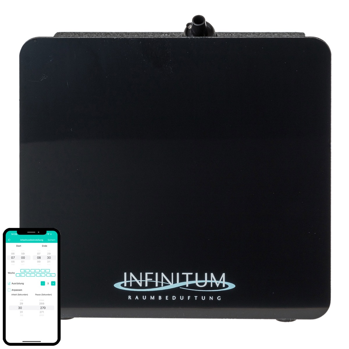 - Steuerung per App für individuelle Raumbeduftung: Wochentag / 5 Tagesprogramme / 10 Intensitätsstufen