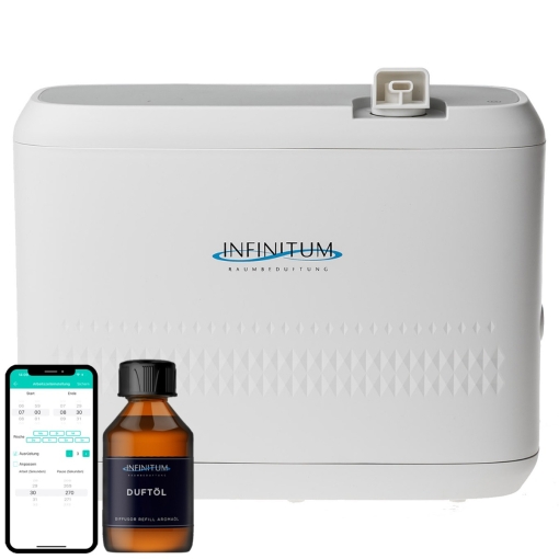 - Steuerung per App für individuelle Raumbeduftung: Wochentag / 5 Tagesprogramme / 10 Intensitätsstufen